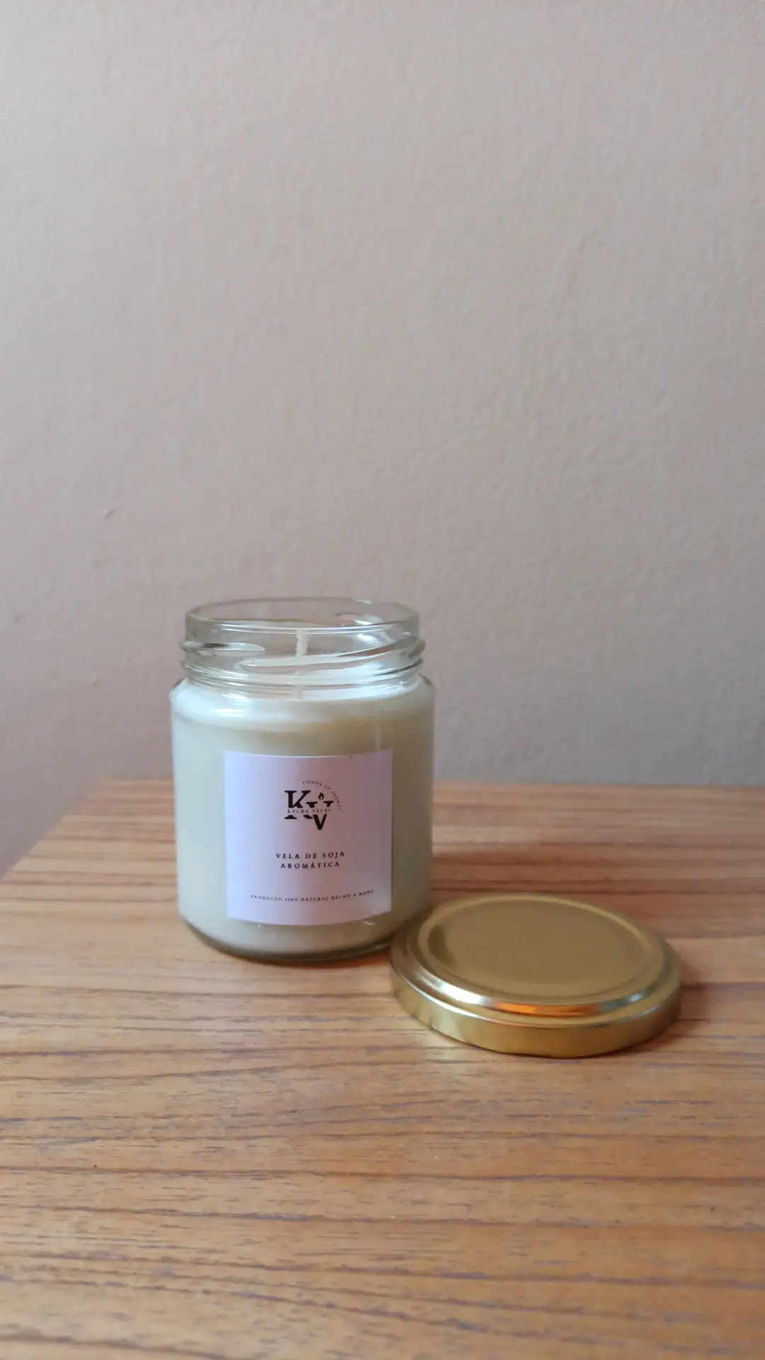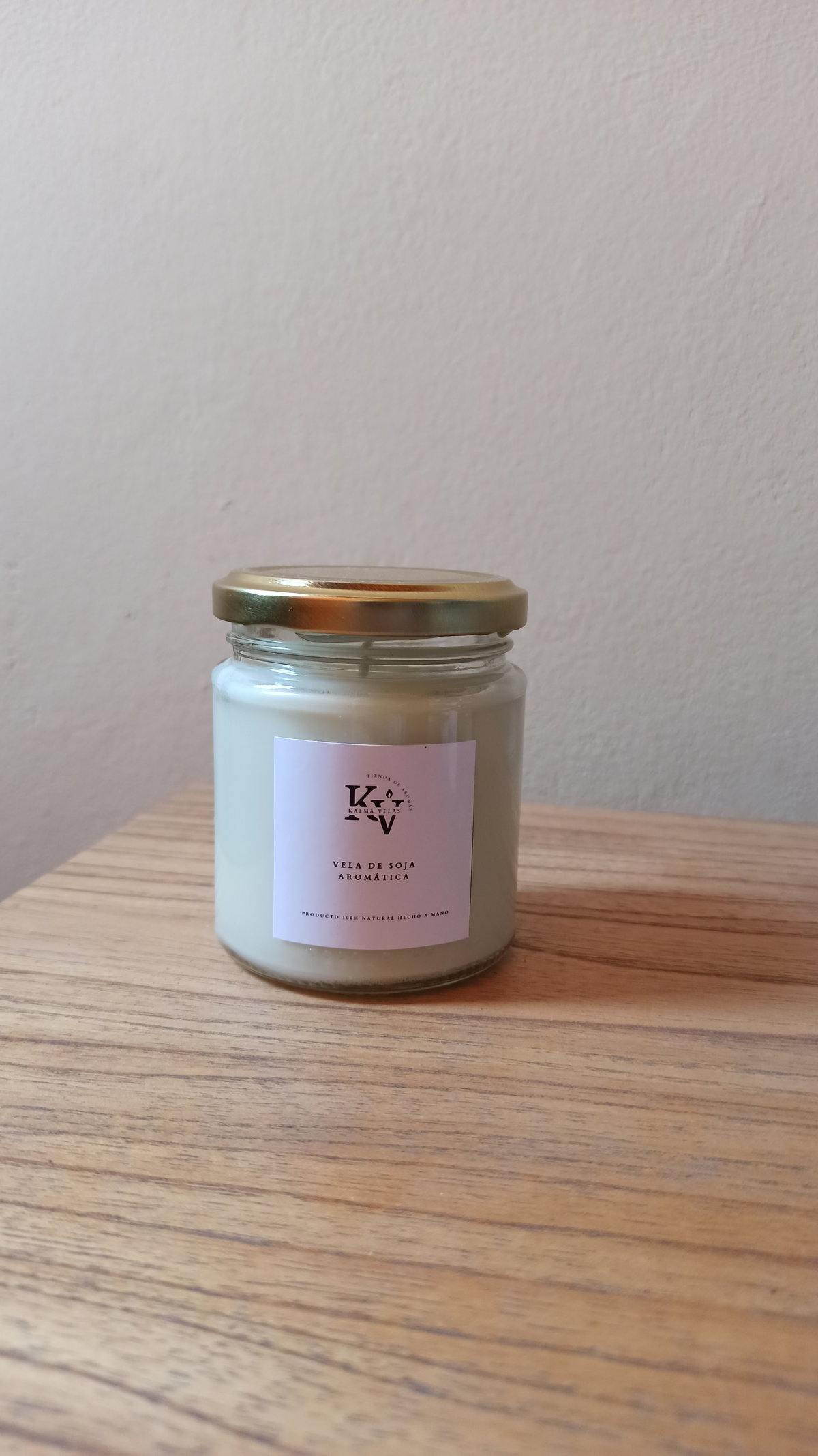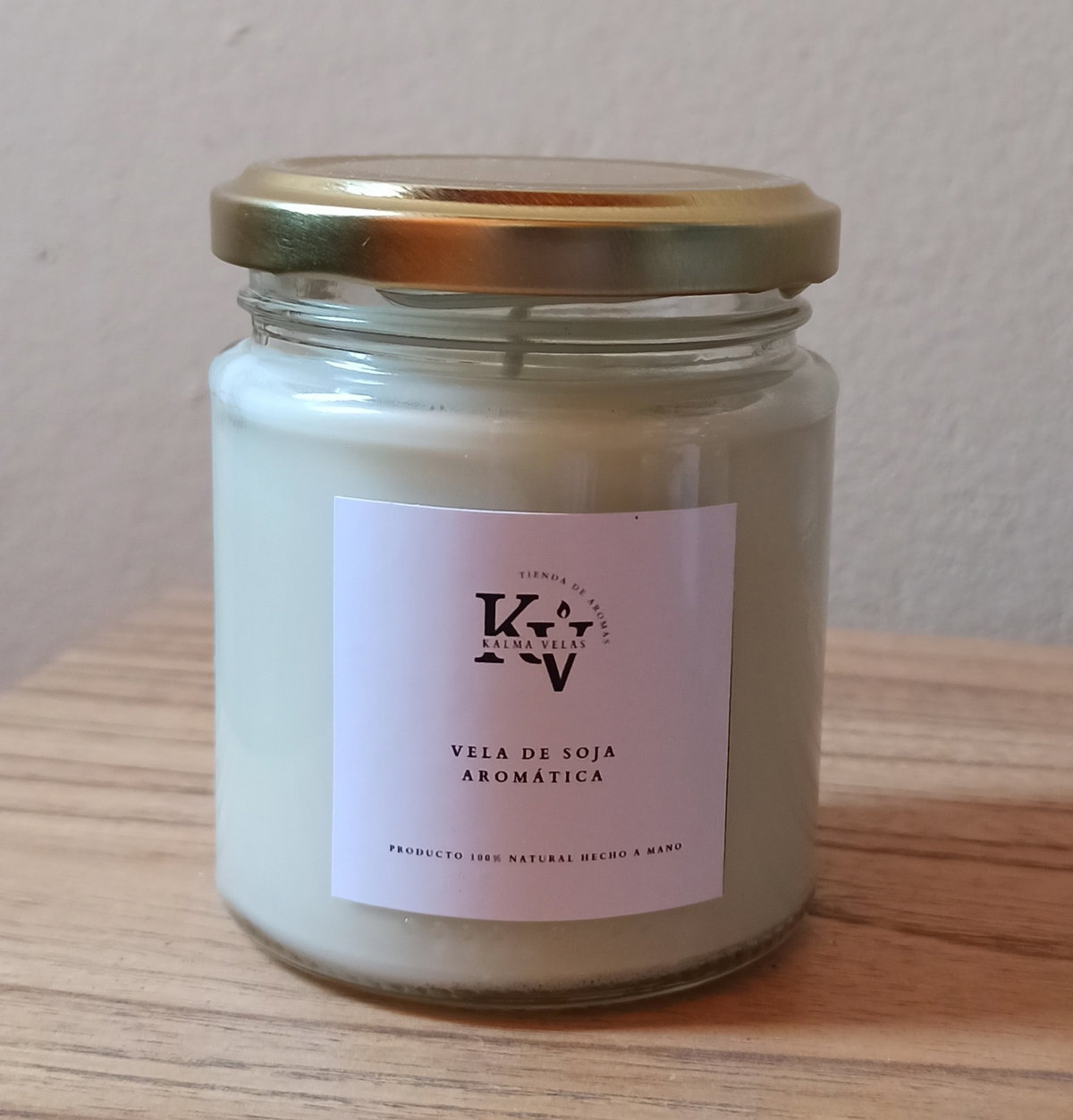 Vela de soja aromática en frasco de vidrio de 200cc con tapa metálica dorada.