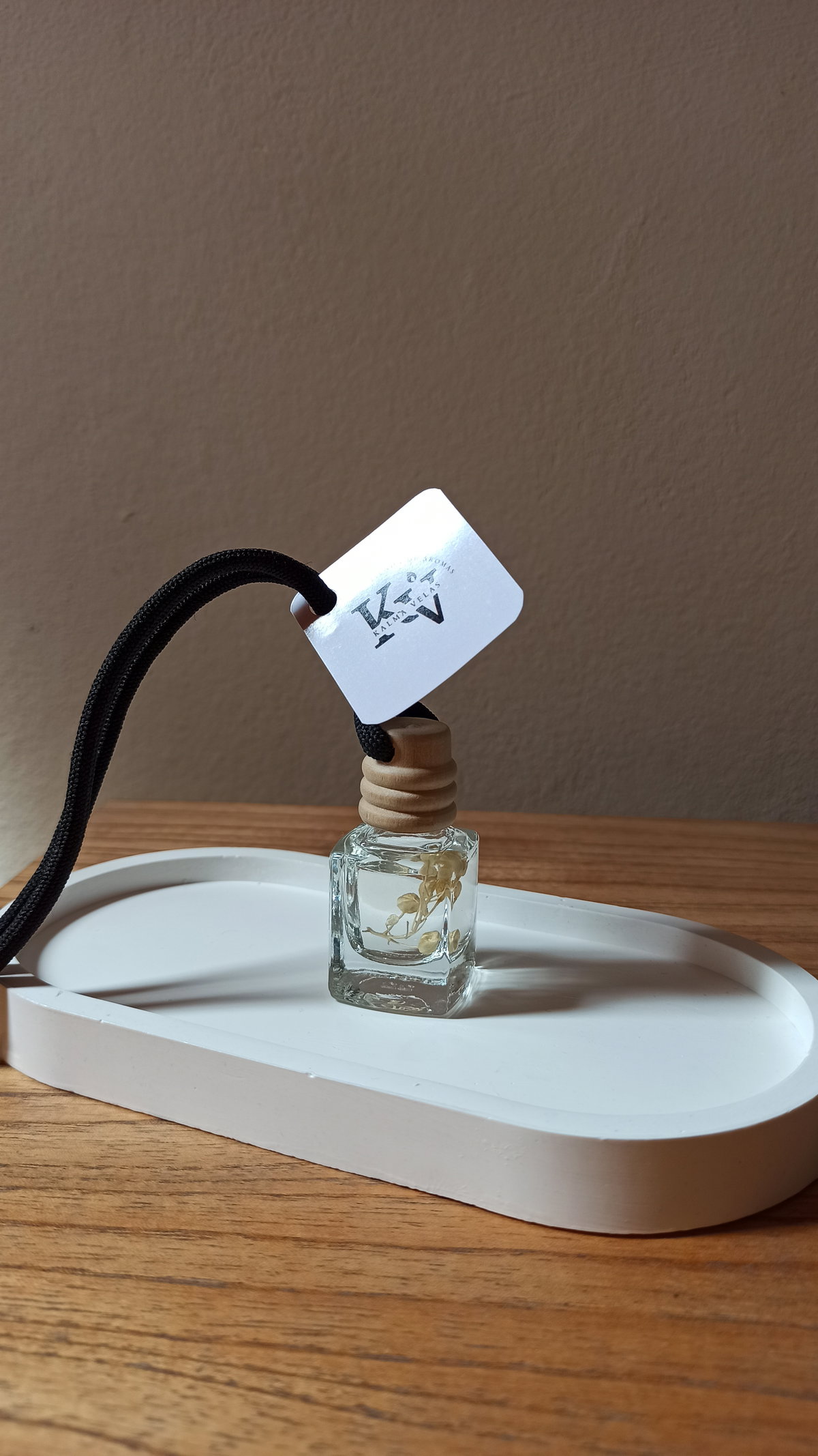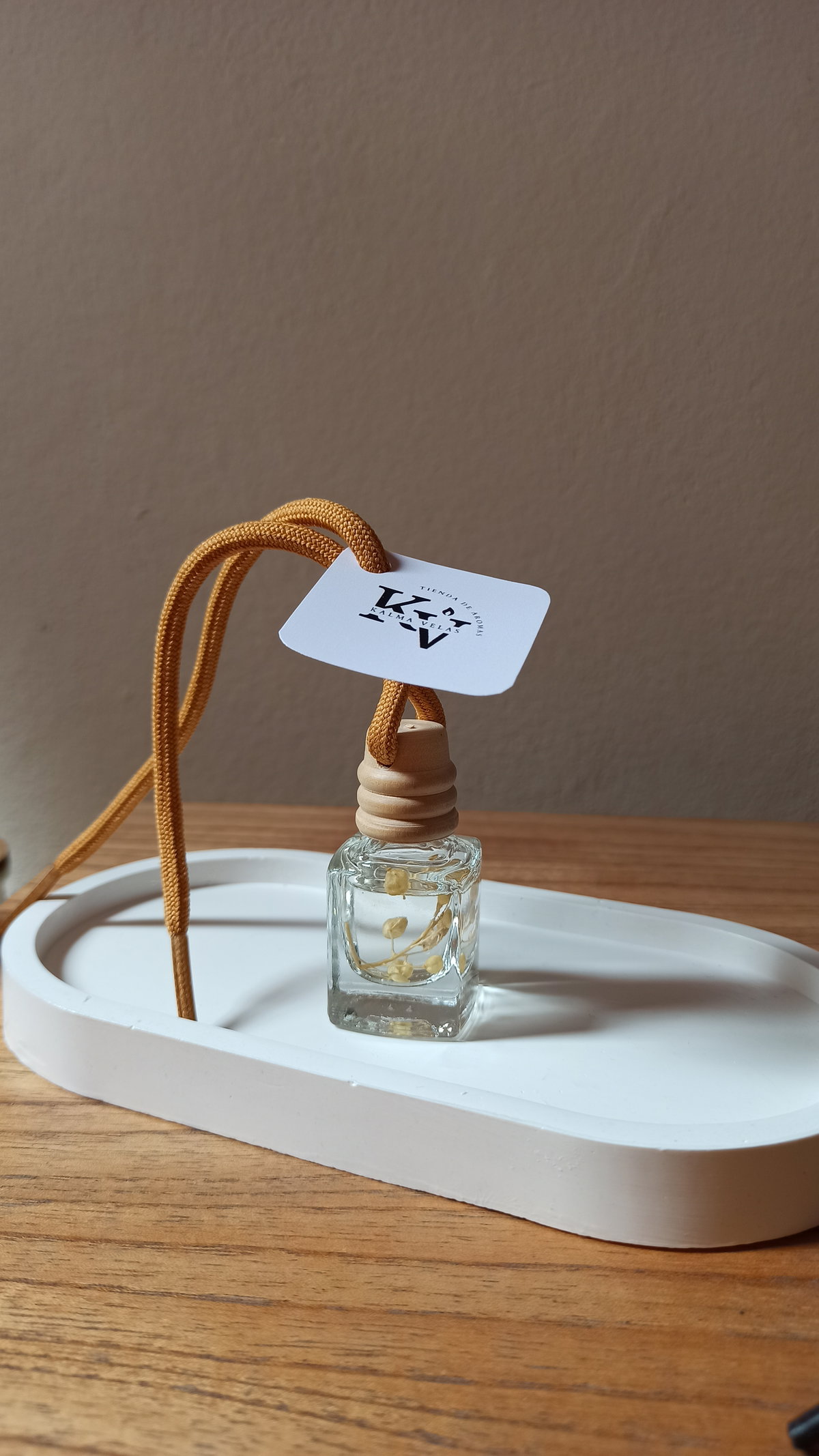 Difusor colgante para auto o Placard en envase de vidrio de 10cc con esencia pura y deco de flores secas, tapa de bambú y cordón