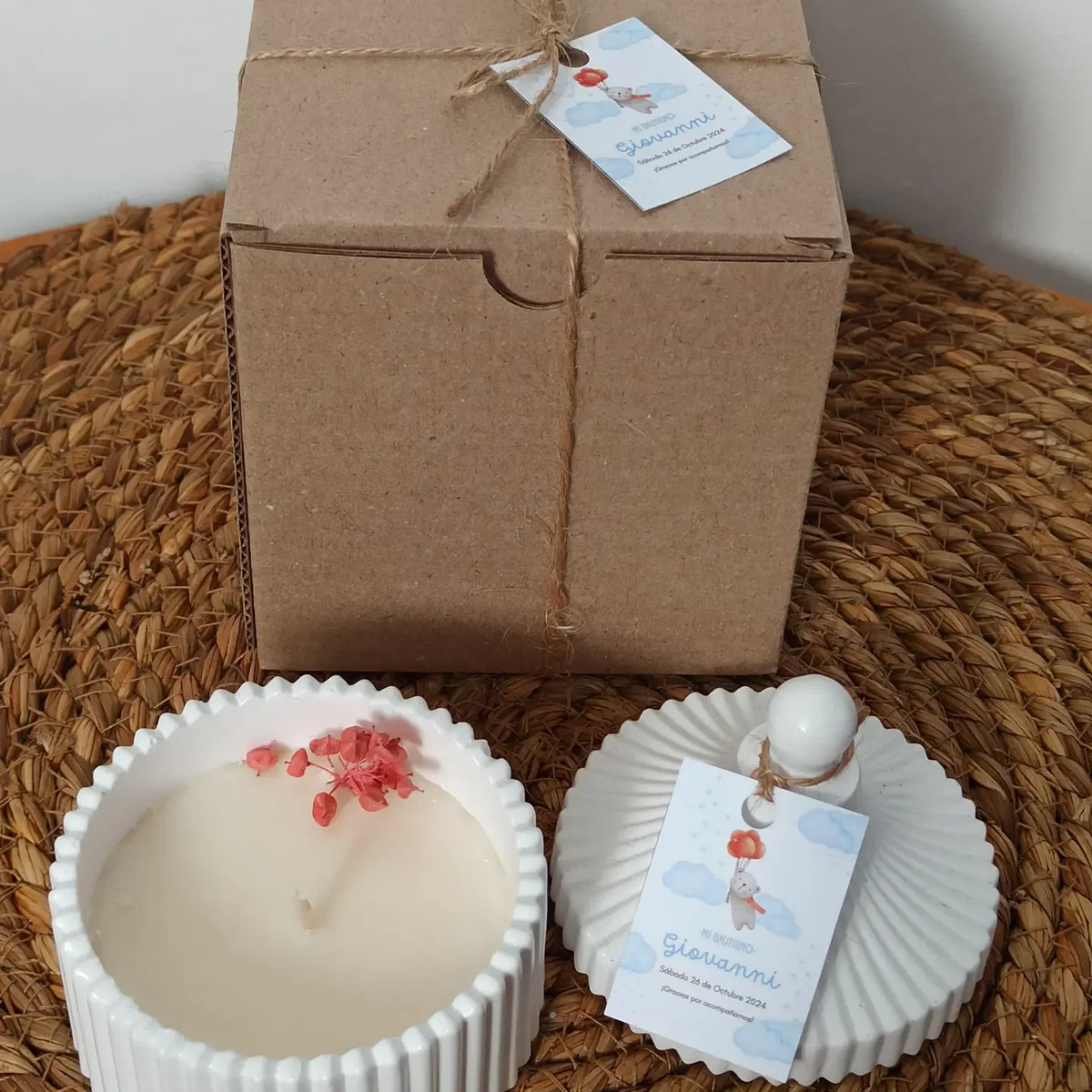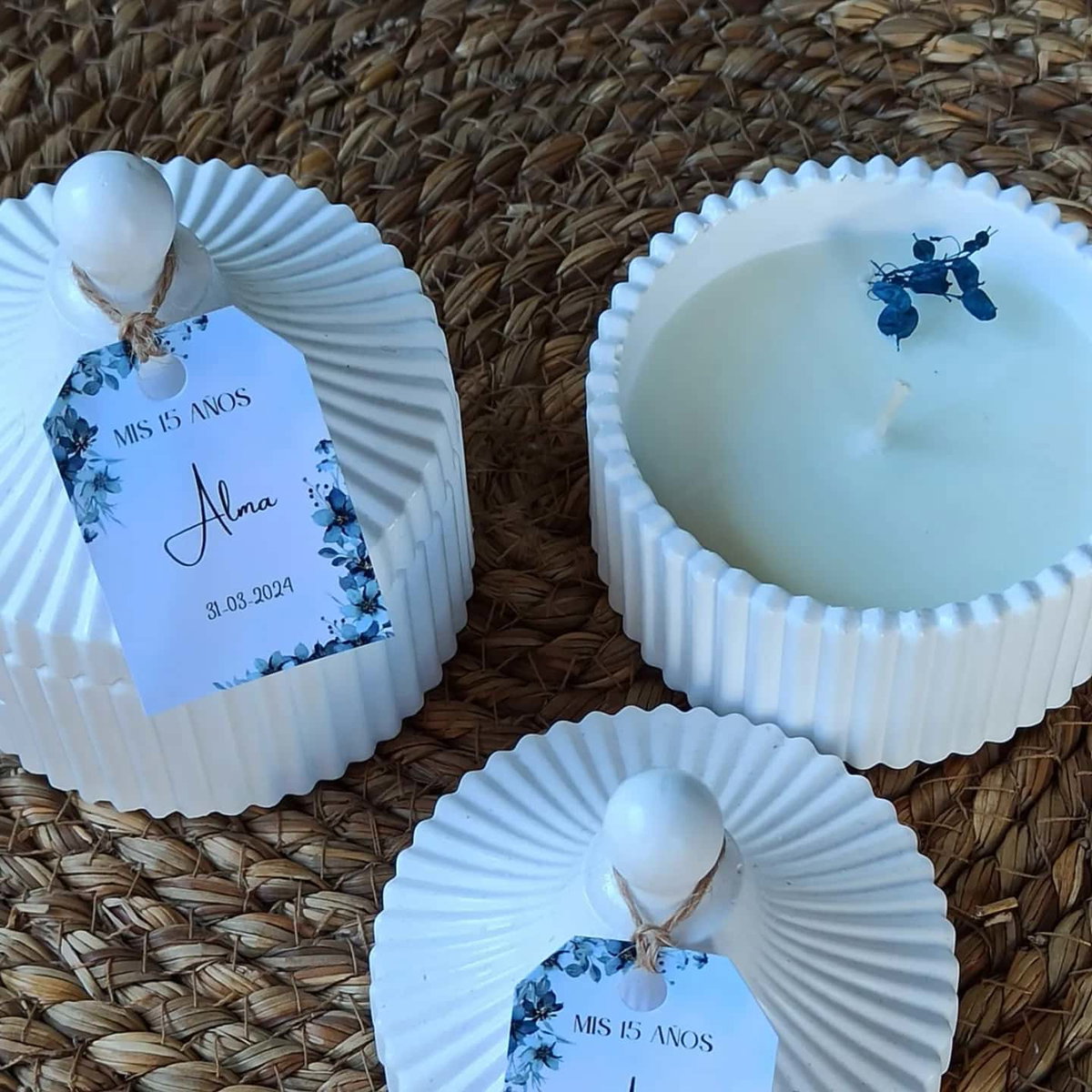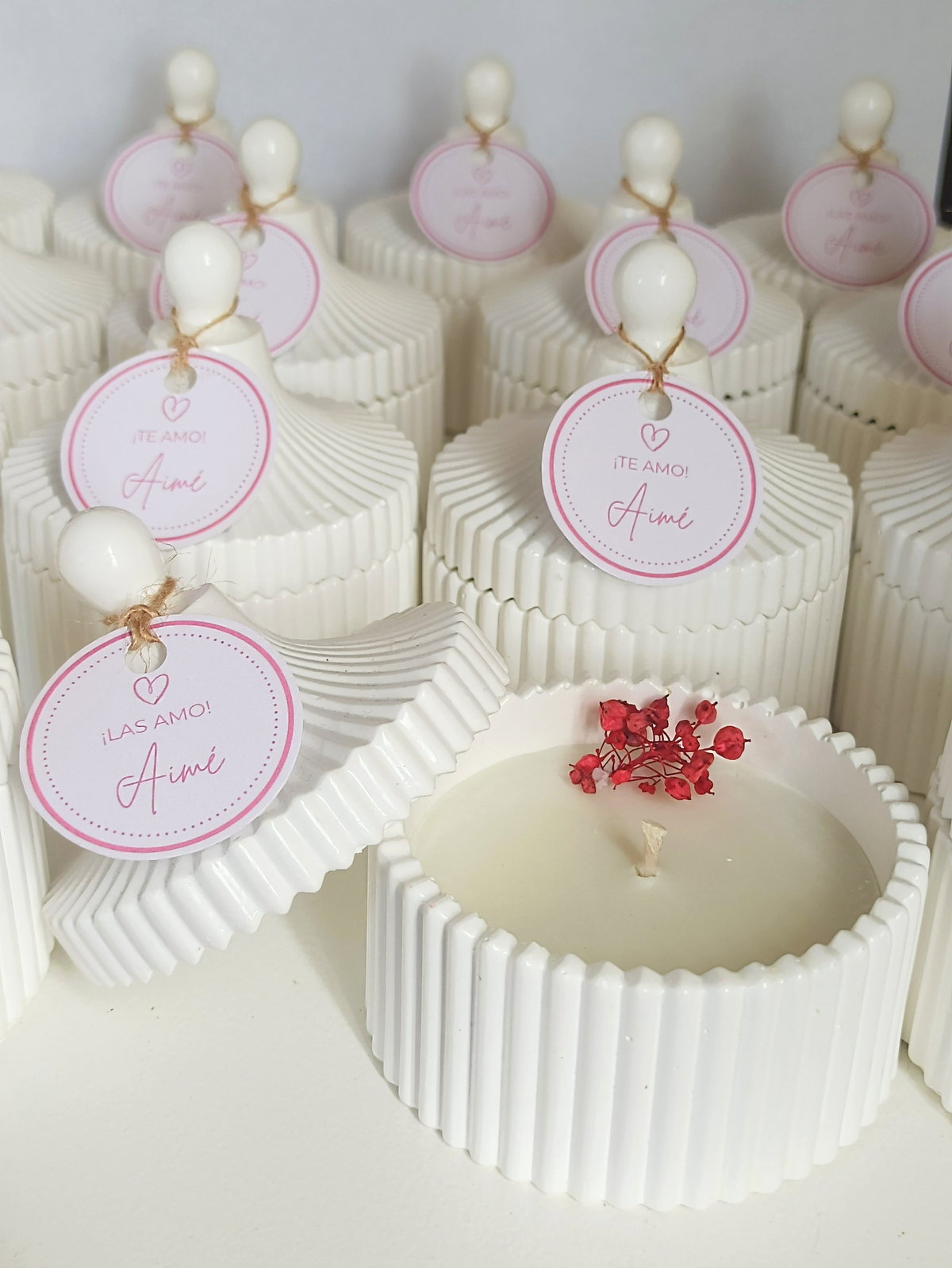 Vela de soja aromática en Caramelera de yeso impermeabilizado con etiqueta personalizada