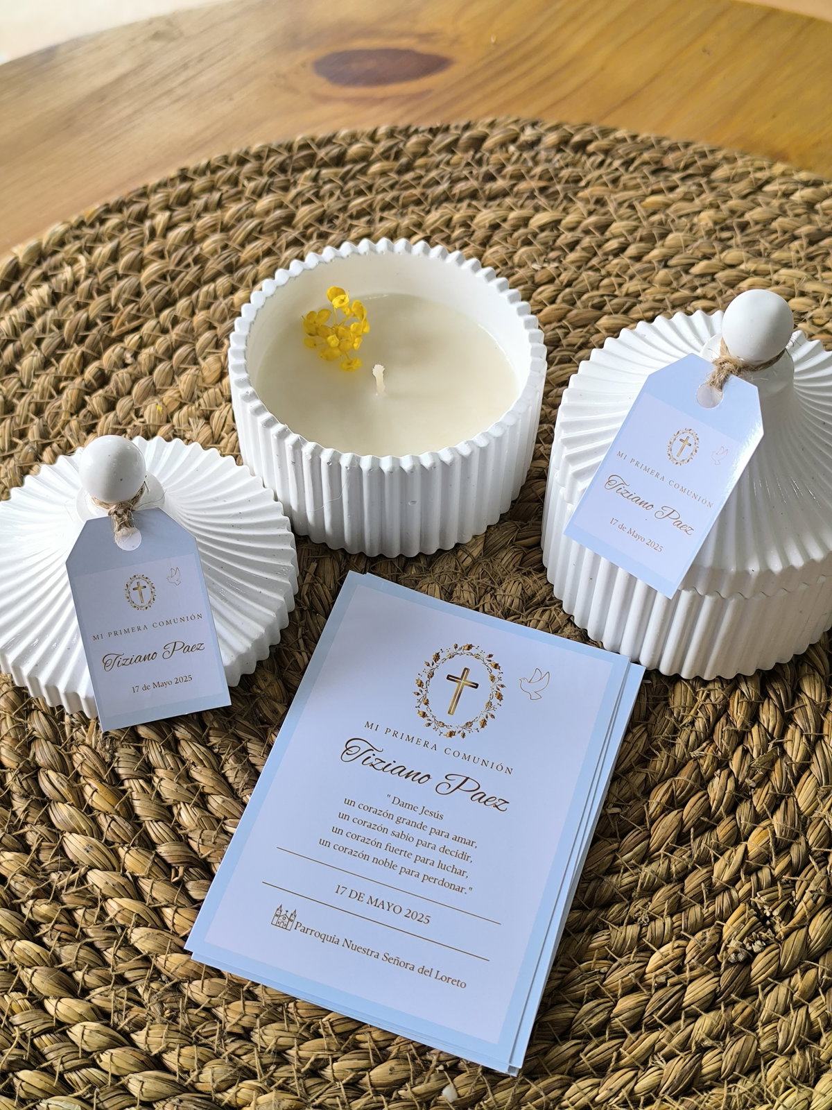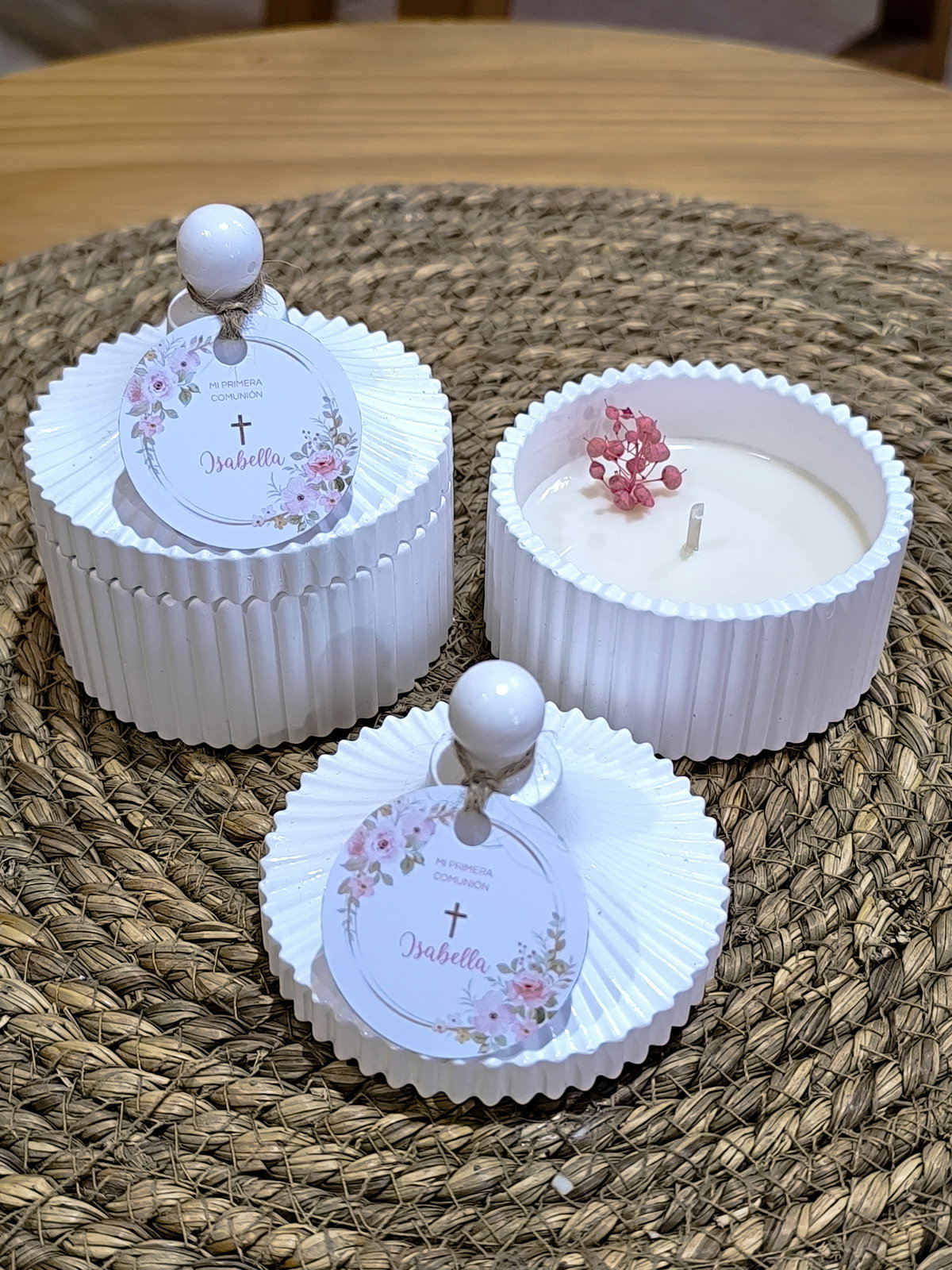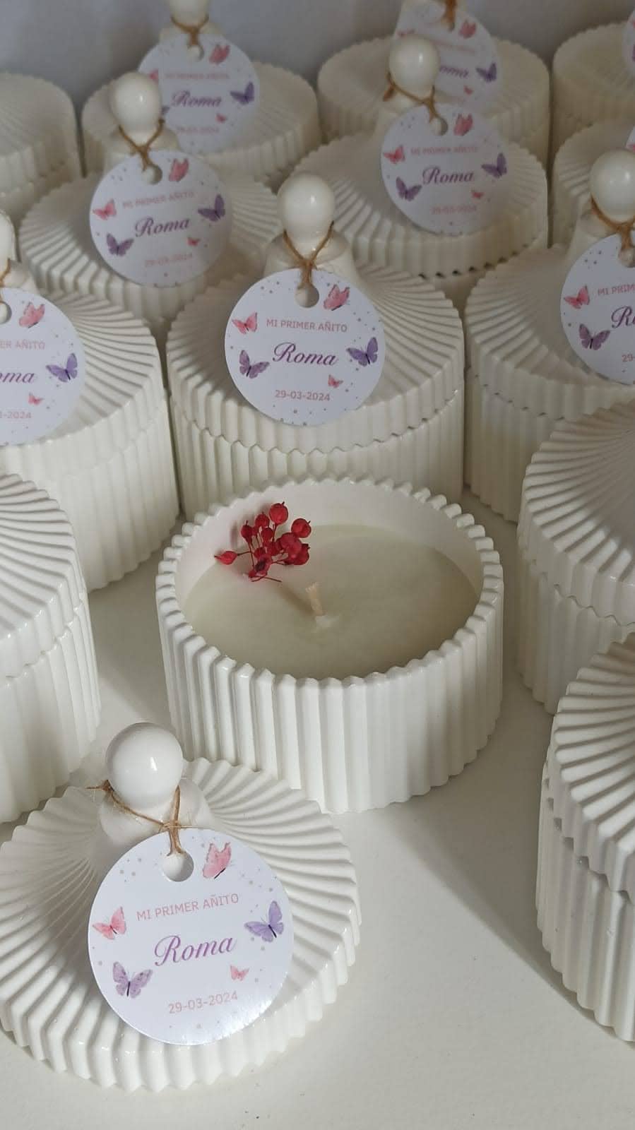 Vela de soja aromática en Caramelera de yeso impermeabilizado con etiqueta personalizada