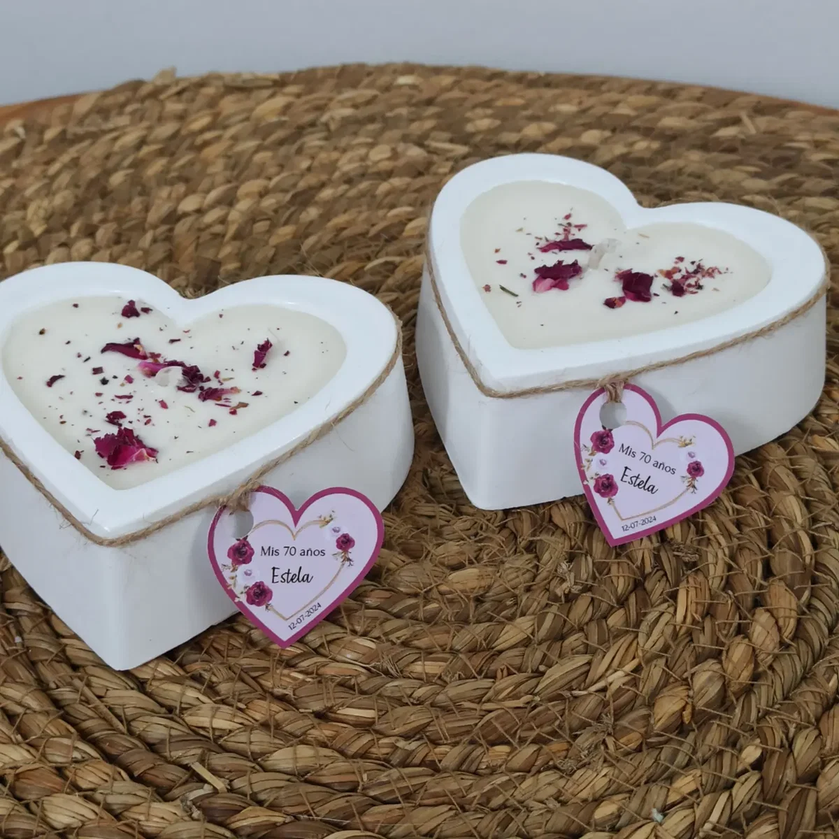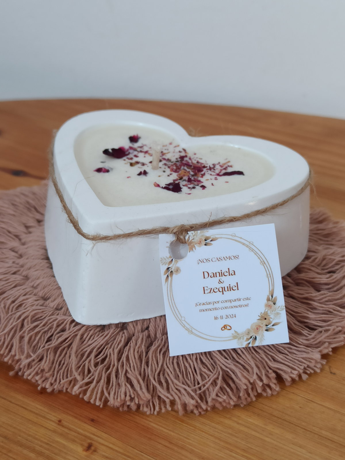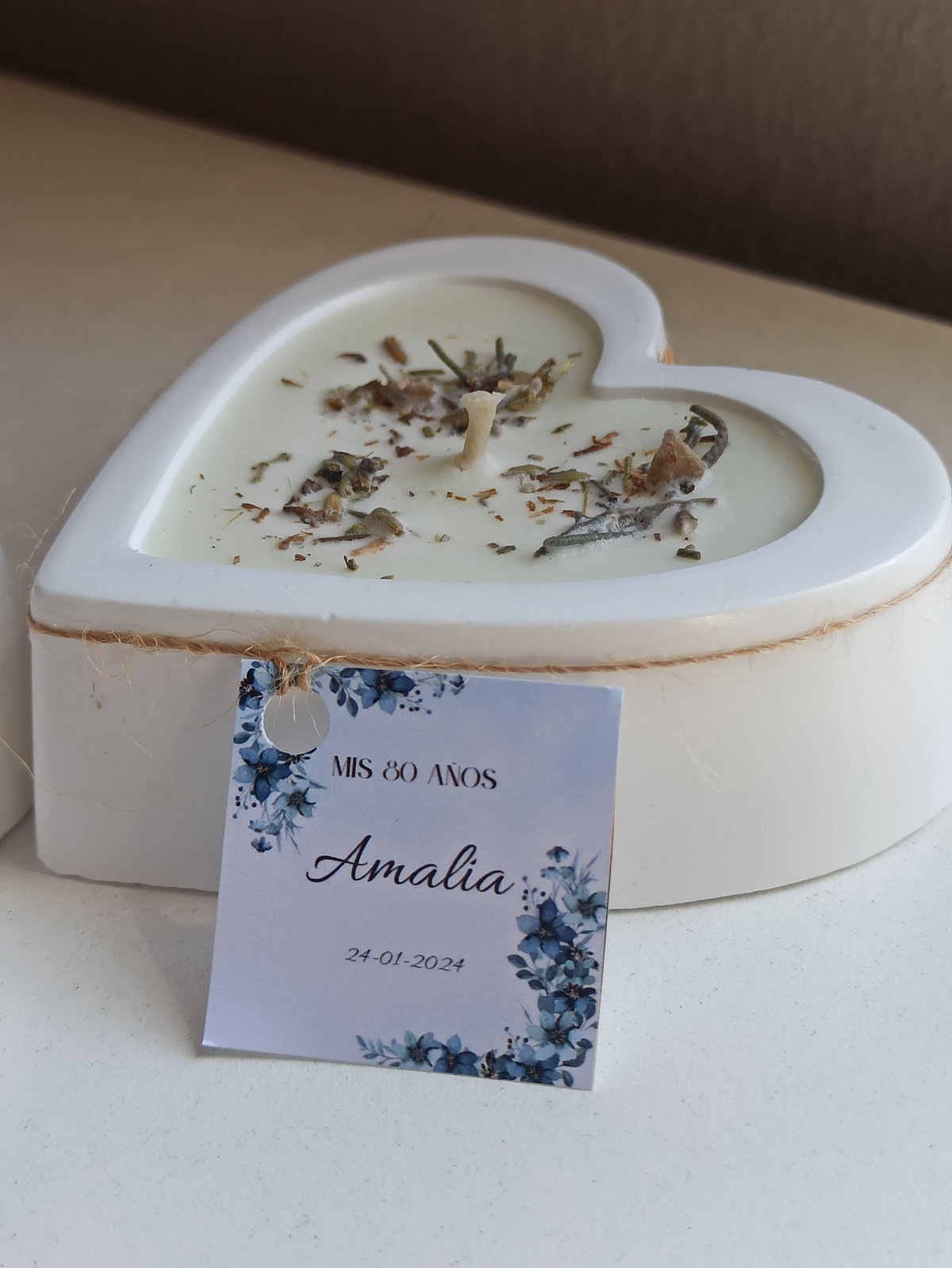 Vela de soja aromática en cuenco corazón de yeso impermeabilizado con flores secas o brillo (a elección). Etiqueta personalizada
