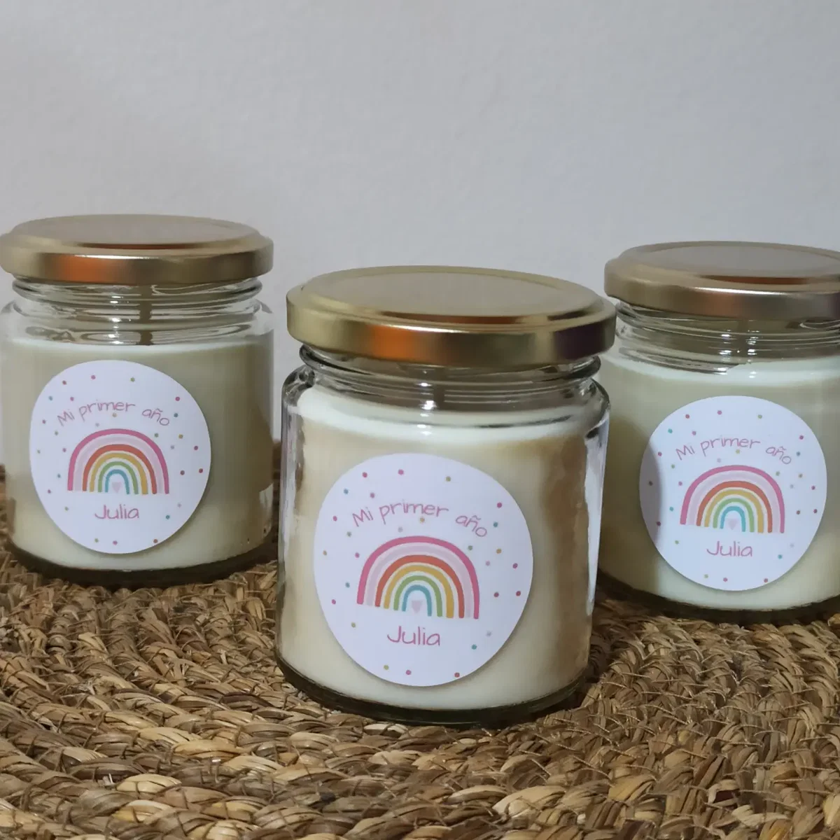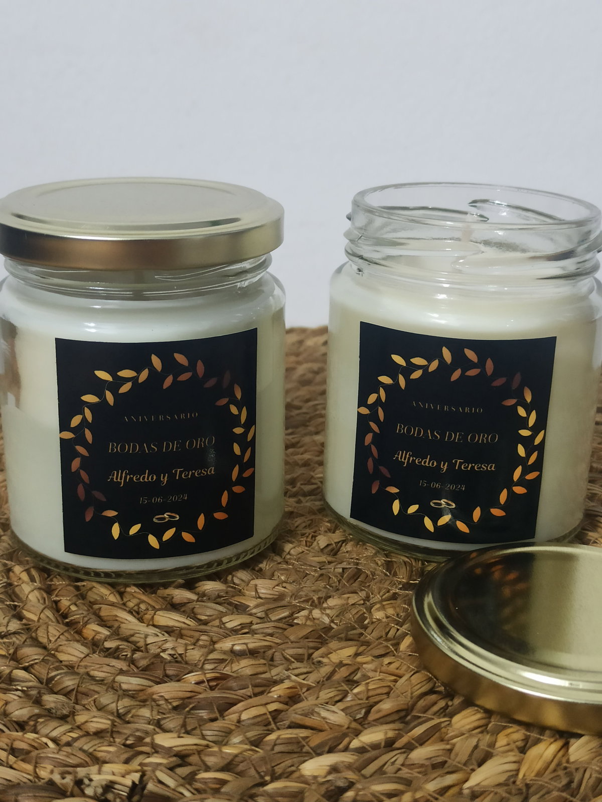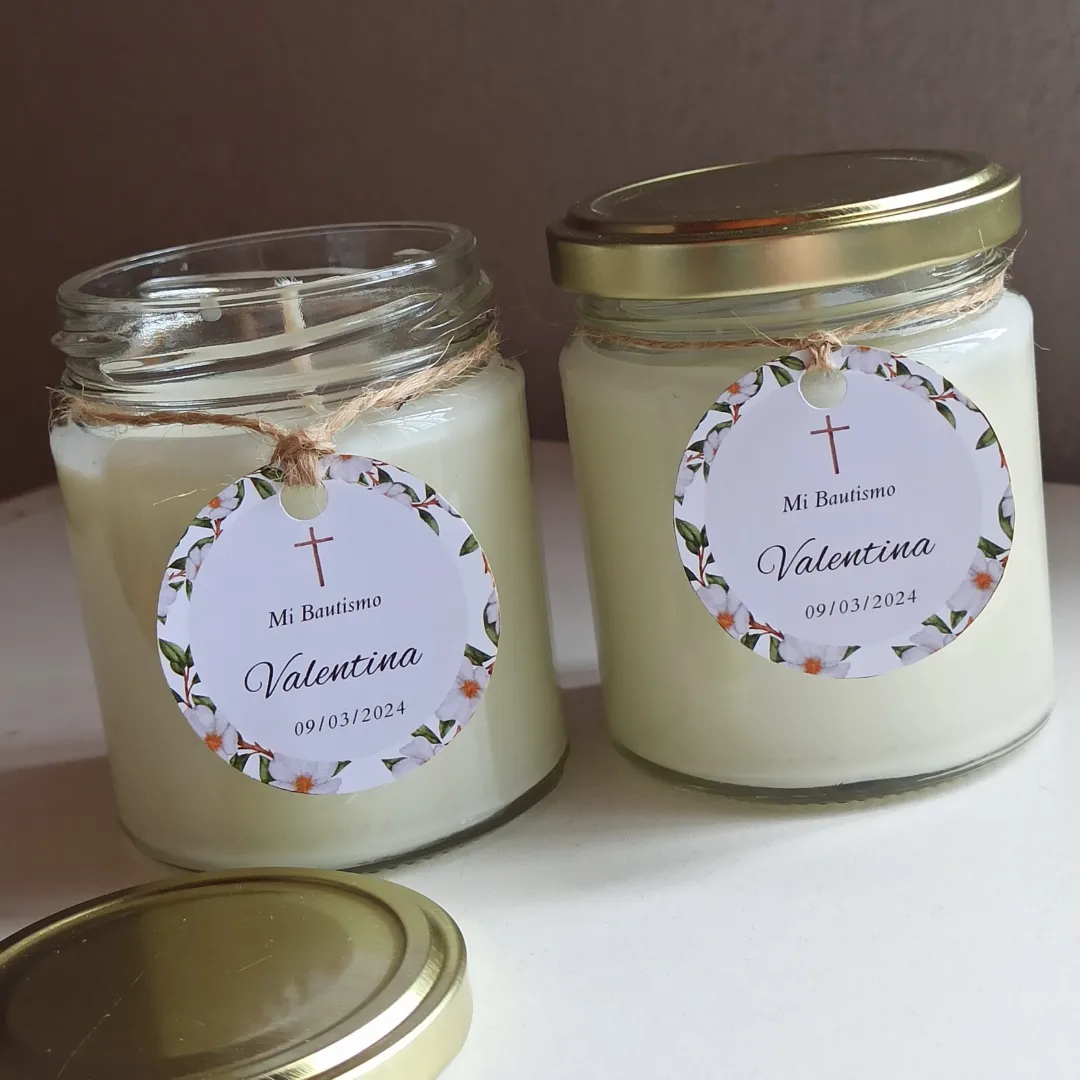 Vela de soja aromática en frasco de vidrio de 200cc con tapa dorada. Etiqueta adhesiva o colgante