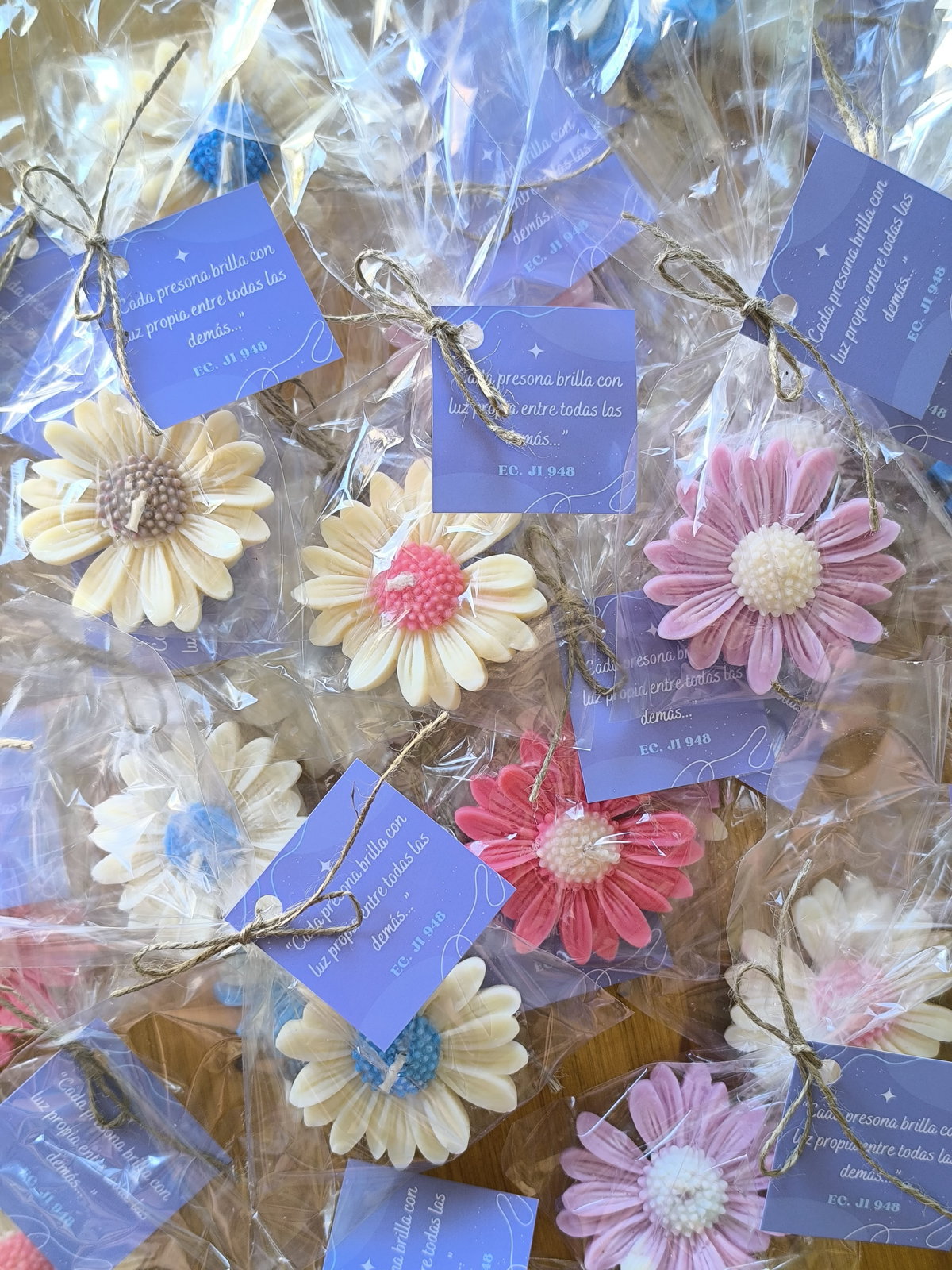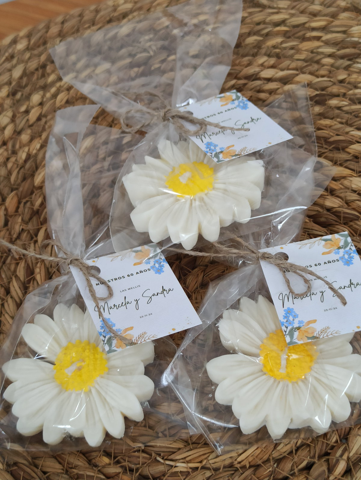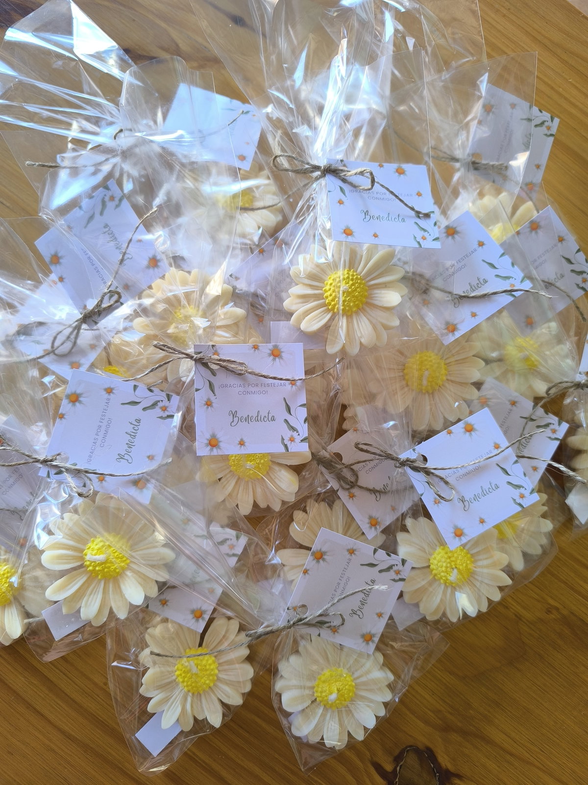 Vela de soja aromática forma de Margarita con bolsita transparente y etiqueta personalizada colgante